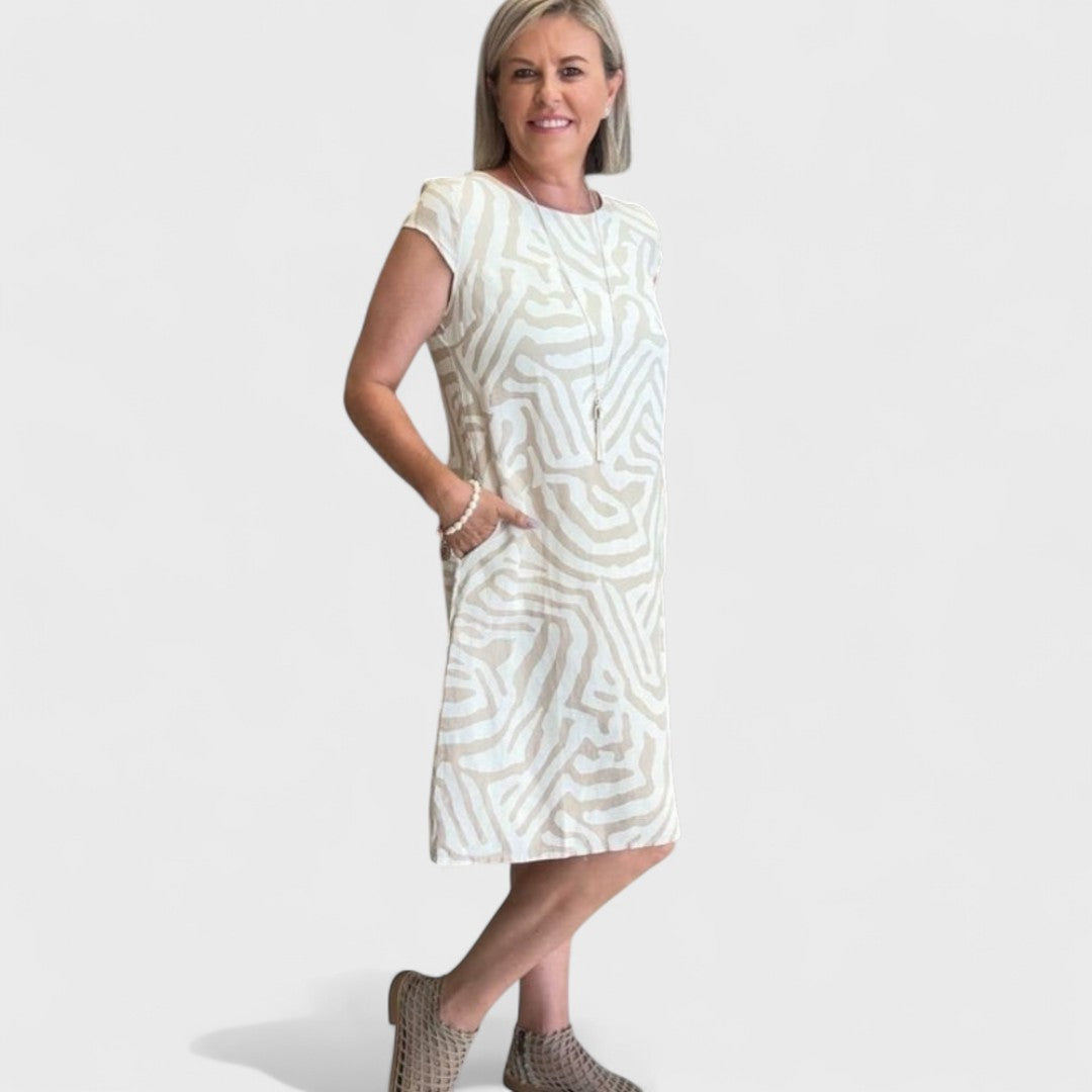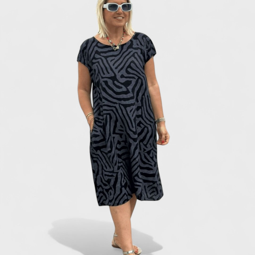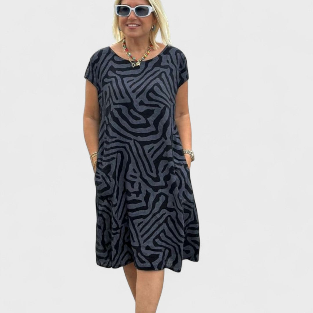 A Nélia ruha kellemesen testhezálló sziluettet kínál finom kerek nyakkivágással és laza szoknyával, amely elegánsan omlik minden lépésnél. A színes vagy stílusos grafikus nyomat lágy színekben frissességet és játékosságot ad a megjelenésnek. Ideális választás kellemes városi napokra, kertipartykra vagy kávézós pihenésre.