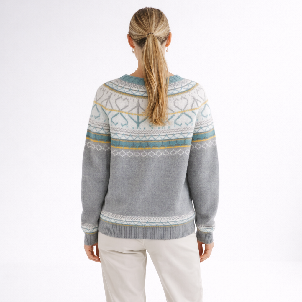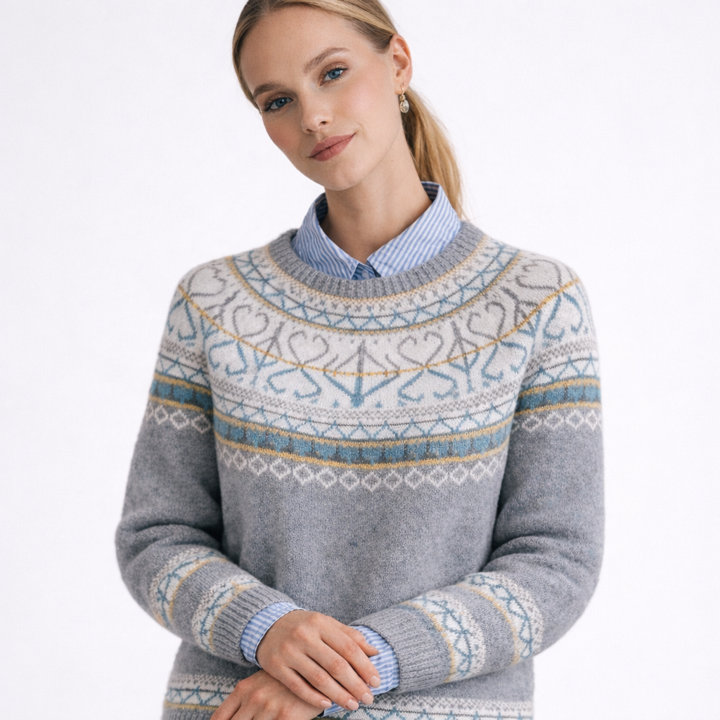 Kifejezetten finom melegséget nyújtva, anélkül, hogy túlzottan megnövelné a ruha térfogatát, ez a pulóver kivételes puhasággal öleli körül a testet. Puha és kényelmes tapintása kíméli a bőrt, míg könnyedsége teljes mozgásszabadságot biztosít. A klasszikus északi mintázat időtálló jelleget kölcsönöz neki, természetes eleganciával emelve minden megjelenést.