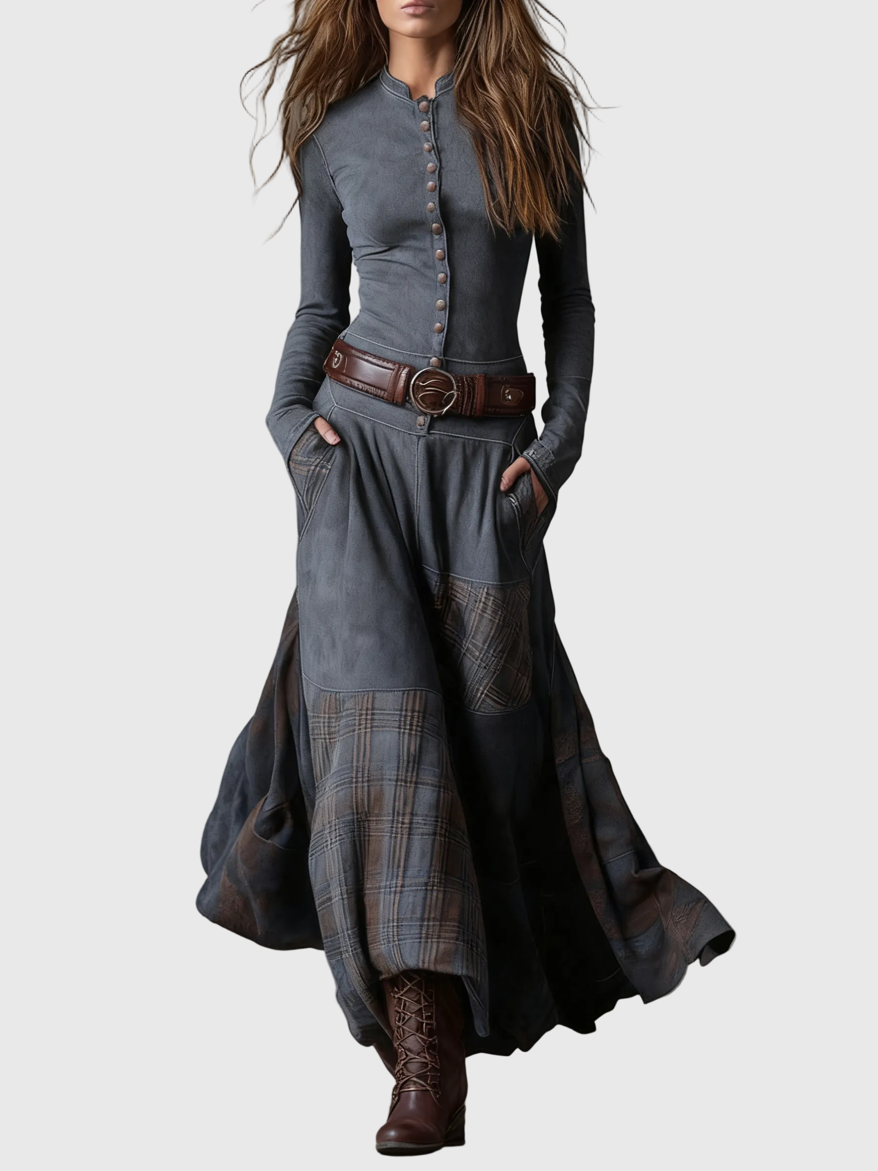 A fitted bodice fém gombokkal kiemeli a sziluettet, míg a folyó szoknya foltvarrás részletekkel mozgást és bájt ad minden lépésnél. Egy ruha, amelyet szabad szellemű nőknek terveztek, akik a megkülönböztetést kedvelik.