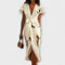 Elbűvölő átlapolós midi ruha élénk levélmintával és kedvező V-nyakkivágással. Ideális bármilyen alkalomra, a brunchoktól a kültéri eseményekig.